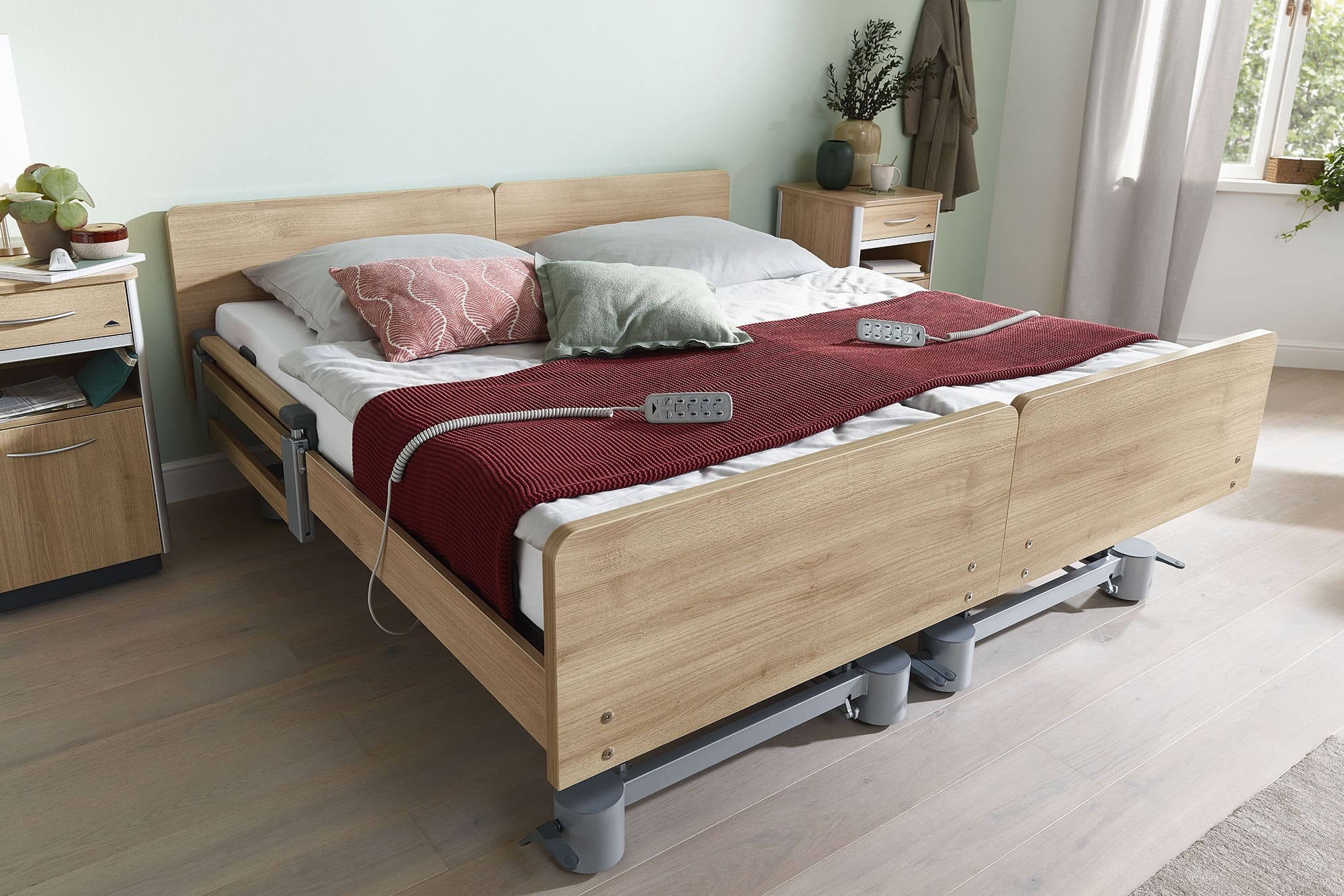 Het tweepersoonsbed voldoet net zo goed aan alle zorgvereisten als de Libra-eenpersoonsbedden. De helften kunnen ook gemakkelijk worden gescheiden en bijvoorbeeld tegen tegenovergestelde wanden van de kamer worden geplaatst. Zo kan rekening worden gehouden met persoonlijke wensen van de partners en met medische indicaties waarvoor een ruimtelijke scheiding ’s nachts gerealiseerd kan worden.